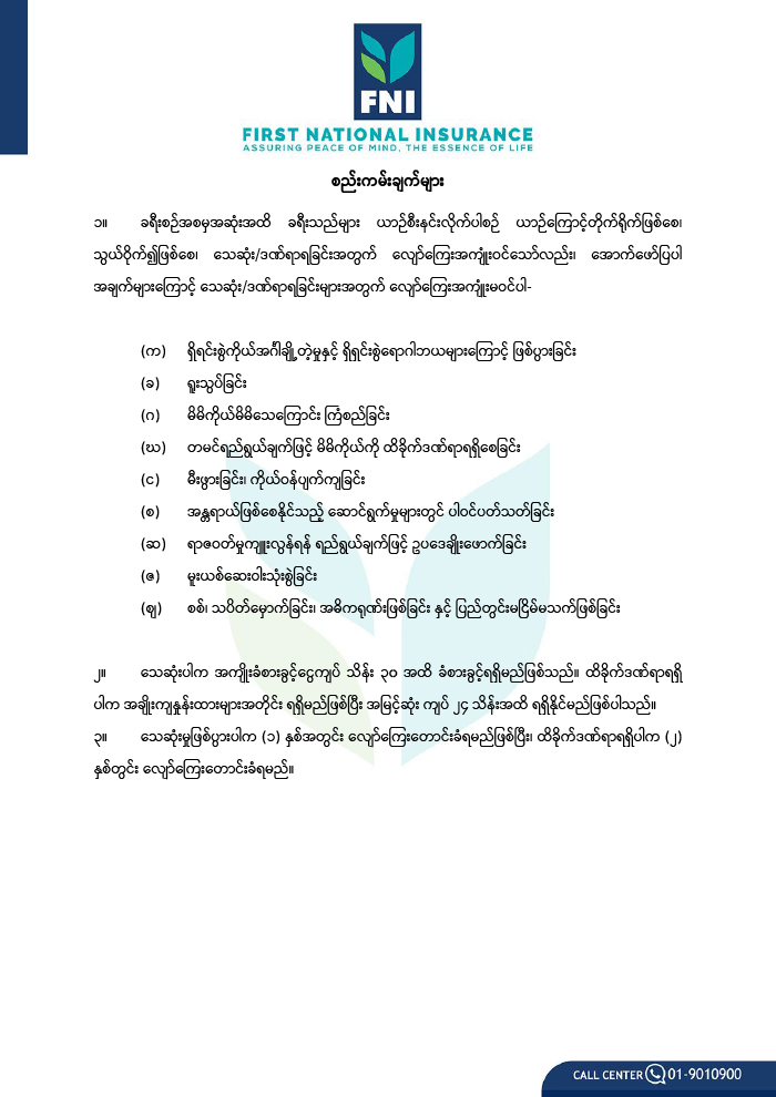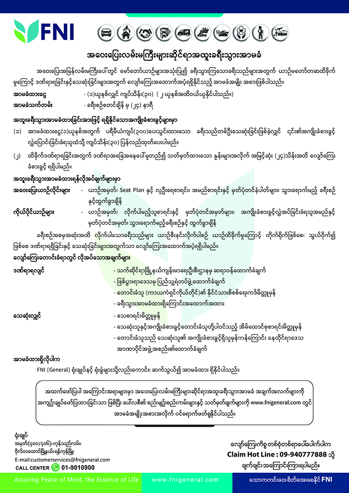 သတင်းပို့ရန် ဖုန်းနံပါတ်      – Claim Hot Line – 09 940777888